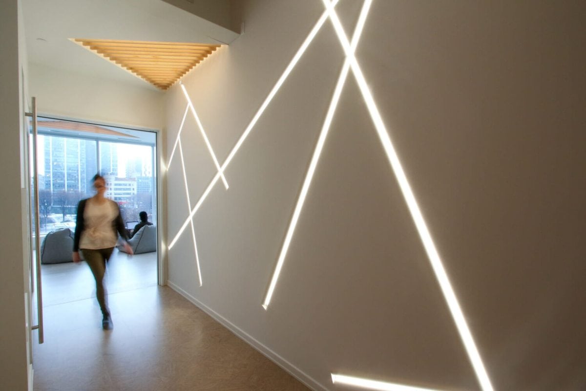 Add smooth internaly lit grooves to your walls using the SULCUS gypsum profile. It is supported on 2×3in. joists or studs, and will level out flush with 5/8 in. gypsum panels, with a little drywall tape and mud. Paint to match your decor, and enjoy the smooth look as well…