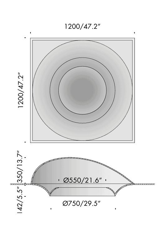 • Campana brembana ribassata 350 sizes 1200x1200x350mm/47.2×47.2×13.7” with diameter Ø750mm/29.5” hole protruding by 142mm/5.5” from the ceiling,