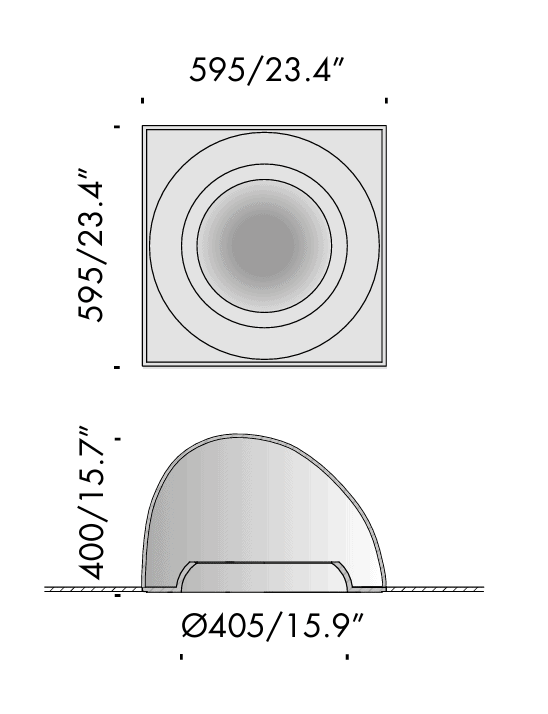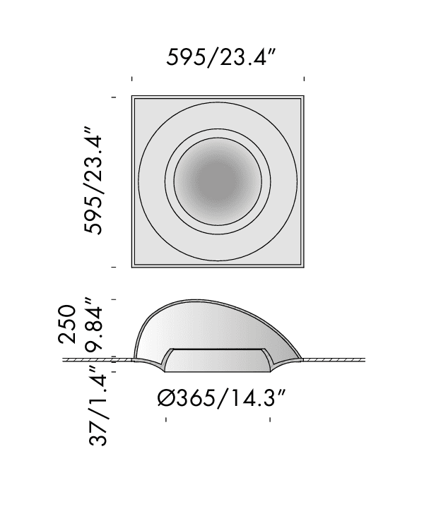 • Campana brembana ribassata 250 sizes 595x595x250mm/23.4×23.4×9.8” with diameter Ø365mm/14.3” hole protruding by 37mm/1.4” from the ceiling.