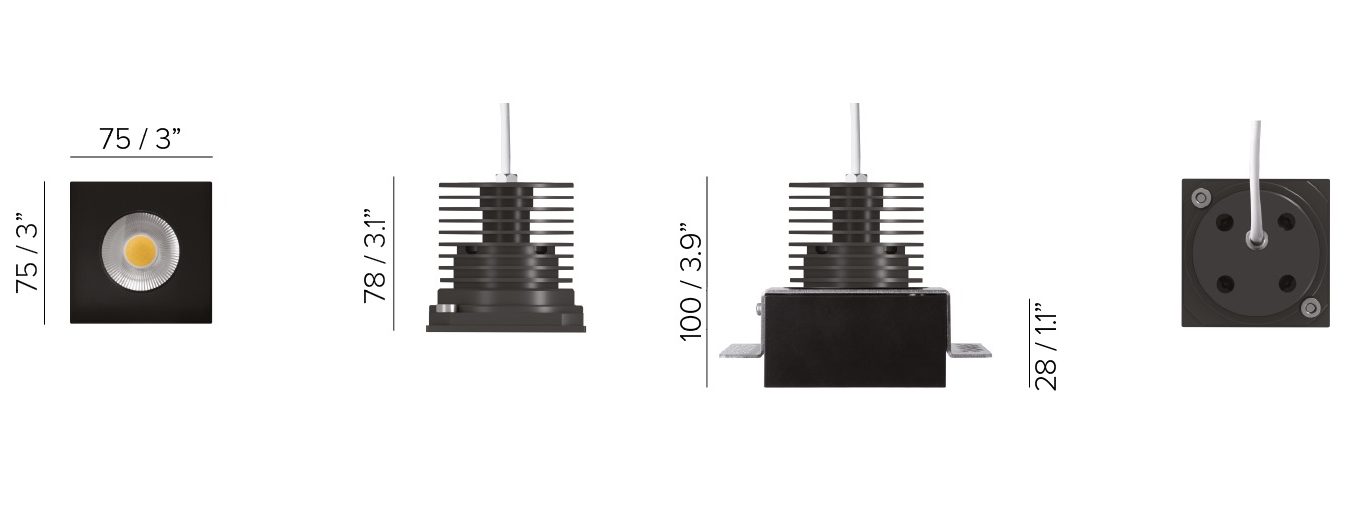 • 48V DC: features an onboard DC driver that ensures overcurrent protection and it is not polarity sensitive. Electronic control of operating temperature through a thermal sensor that detects overheat and, by self-regulating the current, reduces the LED power. This feature guarantees that the luminaire will last in time with ambient temperature up to 140°F