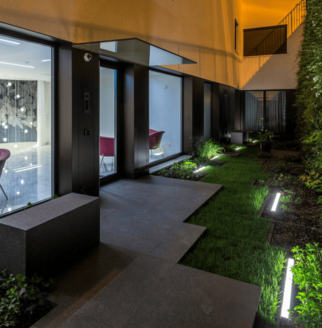• The surface appears evenly lit thanks to the thickness of the tempered glass and the distance from the LEDs. 100% glare-free luminaire
