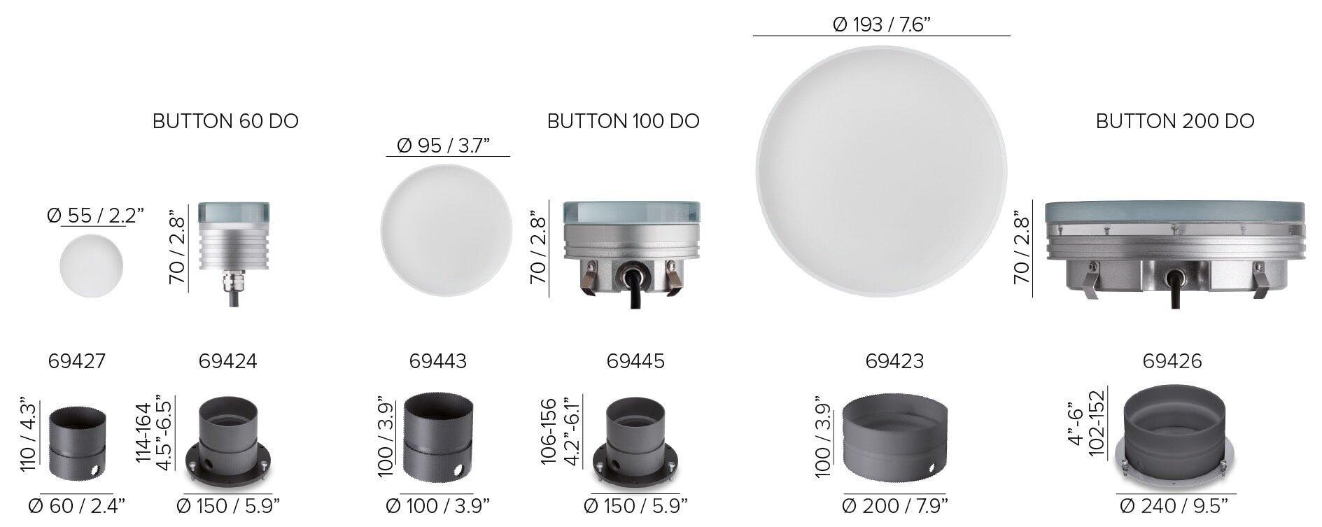 • Available in three sizes: BUTTON 60 DO 2.2” – BUTTON 100 DO 3.7” – BUTTON 200 DO 7.6”