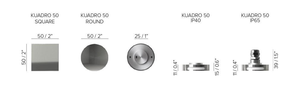 • KUADRO 50 round: diameter 2”. KUADRO 50 square: 2”x2”