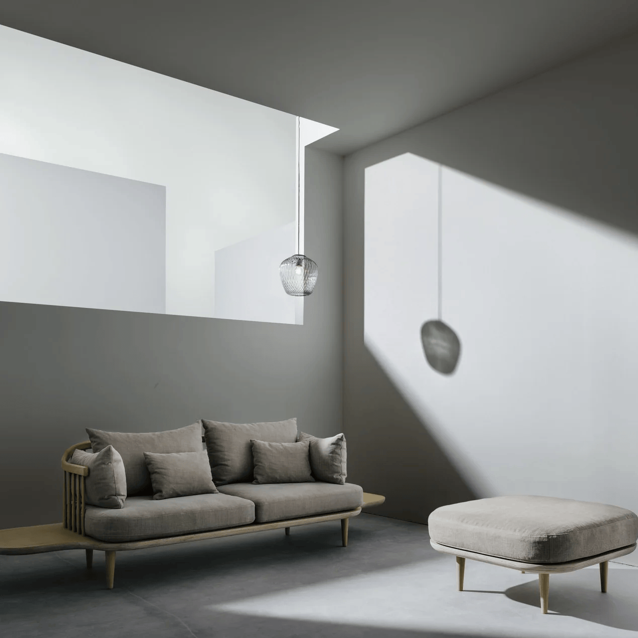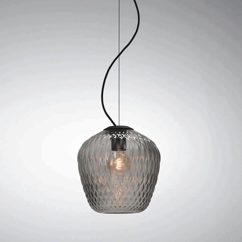 Material: Mouth blown lustre glass, powder coated metal suspension, coated safety wire, fabric cord