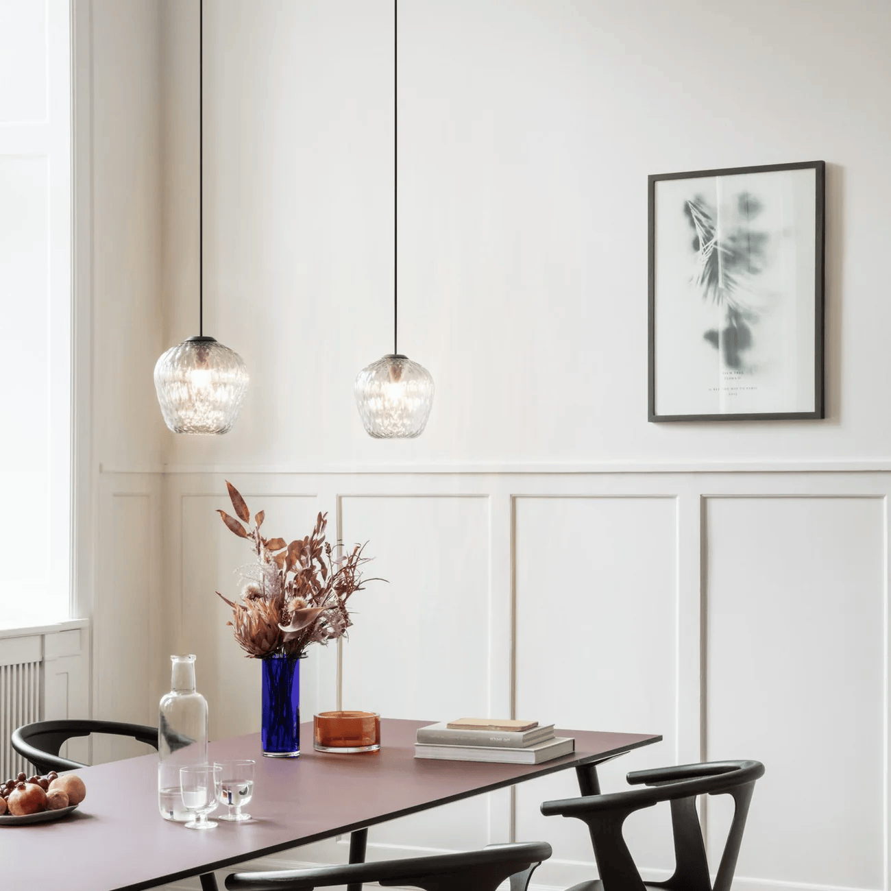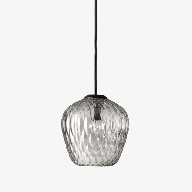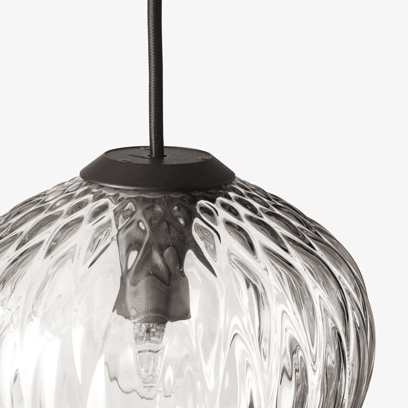 Material: Mouth blown lustre glass, powder coated metal suspension, coated safety wire, fabric cord