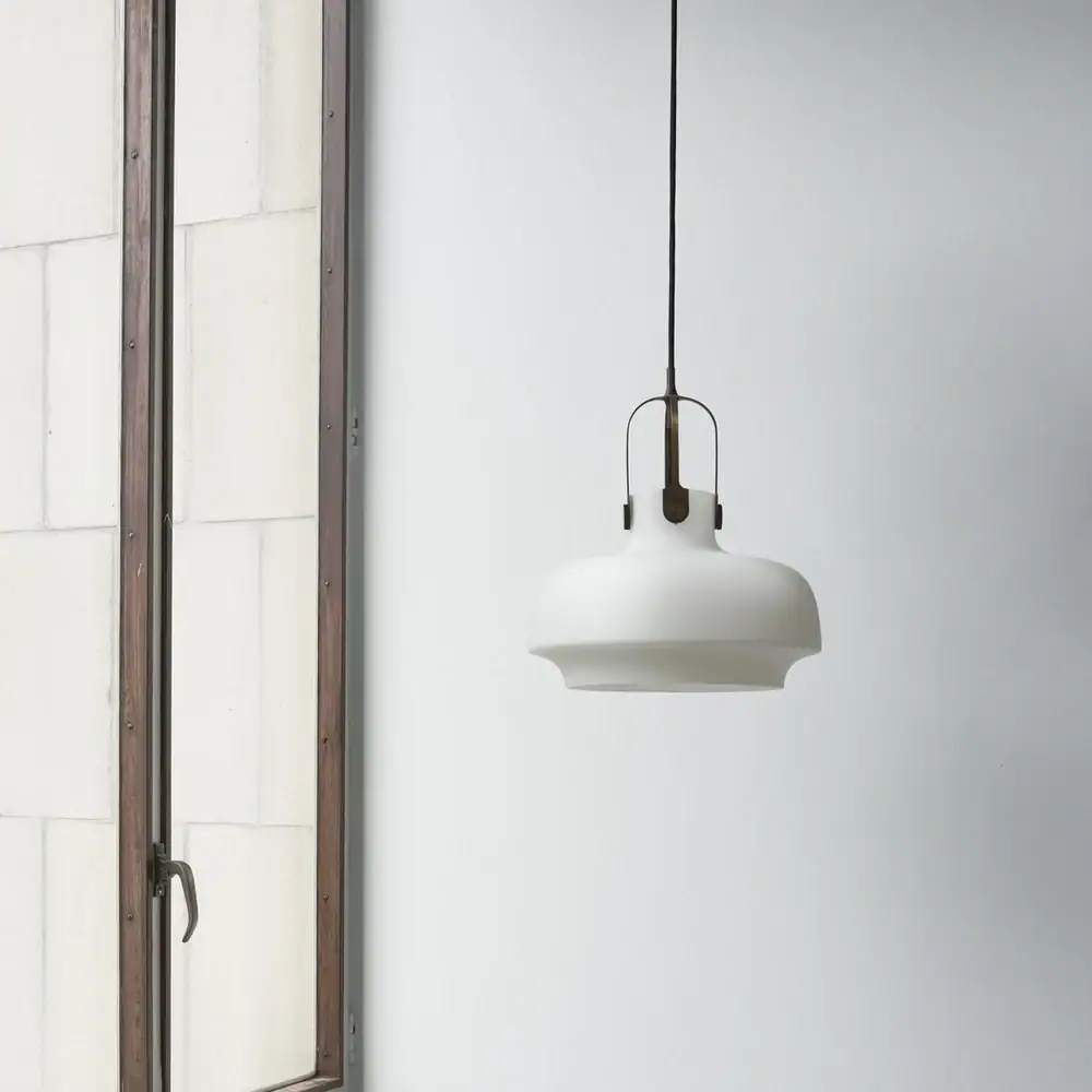 Material: Opal glass or metal shade, bronzed brass or plated steel bracket, 13′ black textile cord with wire.